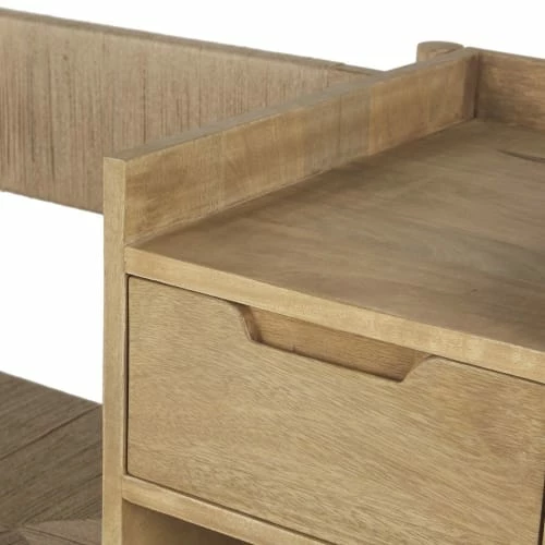 Structure, panneaux du dessous, de côtés, poignées, piètement, étagères, tiroir : manguier massif, finition vernis acrylique transparent mat