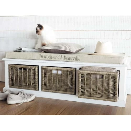 À la recherche d’un banc confortable et fonctionnel pour meubler votre entrée ? Découvrez le banc de rangement 3 compartiments blanc COMPTOIR DES EPICES. À la fois banc et meuble de rangement, il s’avère très pratique et donnera du cachet à votre petit espace. Les atouts de ce meuble d’entrée ? Son matelas en coton beige ainsi que ses trois paniers en rotin. Un véritable 2 en 1 qui s’intégrera parfaitement dans une déco classique chic, maison de campagne ou bord de mer !